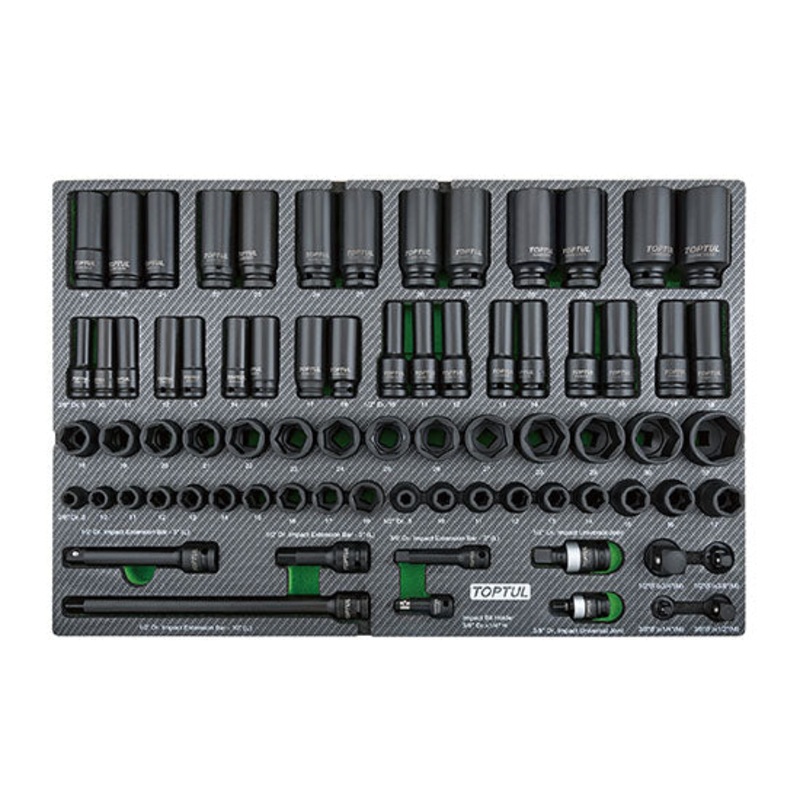 1 x Impact Bit Holder: 3/8" Dr. x 1/4" (H)1 x 3/8 Dr. Impact Universal Joint1 x Impact Adapter: 3/8" (F) x 1/4" (M)1 x 3/8" Dr. Impact Extension Bar: 3" (L)10 x 3/8" Dr. 6PT Flank Impact Sockets: 8, 10, 11, 12, 13, 14, 15, 16, 17, 19 mm9 x 3/8" Dr. 6PT Fla