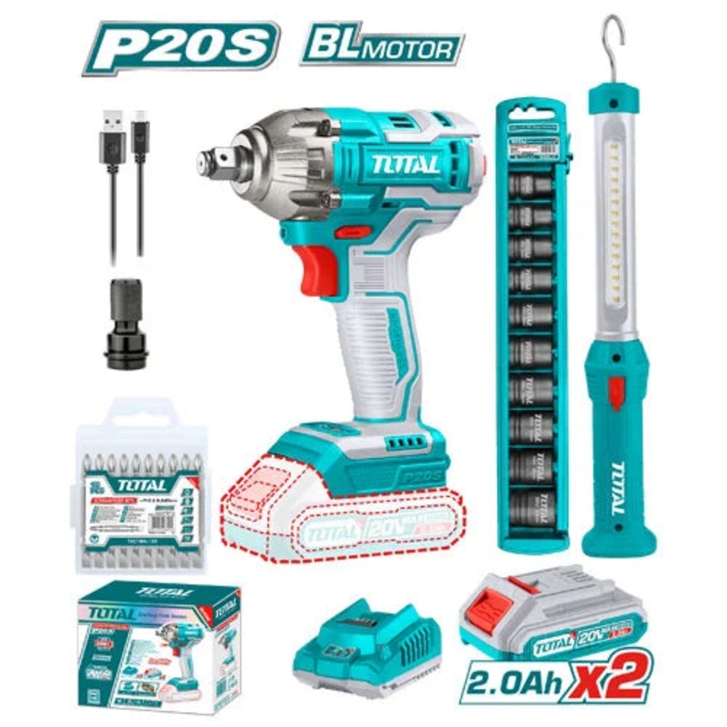 Voltage: 20V1 Pcs Lithium-Ion impact wrench(TIWLI2038) 1 Pcs Work lamp(TWLI35261)Lithium-Ion Impact wrench(TIWLI2038): Brushless motorVoltage: 20V Square drive: 1/2"No-load speed: 0-1300/0-2300rpm Impact rate: 0-2000/0-3300bpm