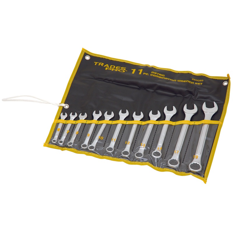 Carbon steel, chrome plated, raised panel designTriple chrome plating to prevent rust and corrosionFeatures 15? offset and chamfered open end for easy accessPackaged in a vinyl rollIncludes 6mm, 7mm, 8mm, 9mm, 10mm,11mm, 12mm, 13mm, 14mm, 17mm, 19mm