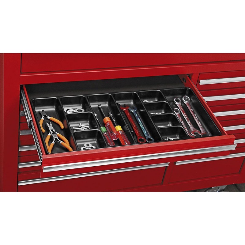 This drawer organizer is ideal for storing small parts. The drawer organizer fits perfectly inside our industrial quality roller tool chest, available separately.