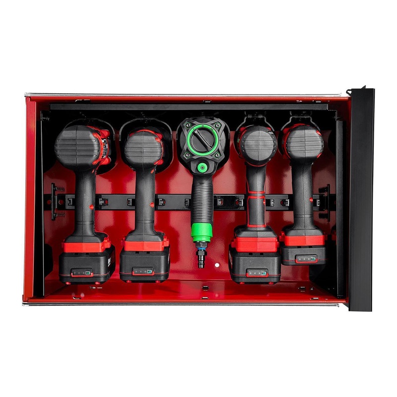 • Holds as many as five cordless power tools or air tools
