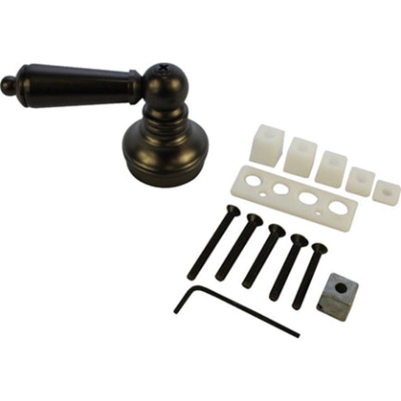 Faucet Lever Handle, Oil Rubbed Bronze. Durable plastic and metal construction provides strength and reliability. Universal fit designer handle will fit most faucets except Moen and Delta faucets. Variety of the most popular handle bushings with a gauge for accurate sizing. Includes (1) handle, (7) different sizes of plastic handle bushings, (2) plastic spacers, (1) universal metal bushing, (5) screws, and an Allen wrench for an easier installation. Includes (1) handle. Lever handle is 2 in. long and bottom of handle has a width of 1-9/16 inches. Oil rubbed bronze lever handle gives a up-scale modern look to your bathroom.
