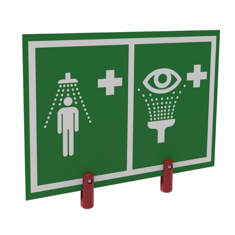 Universal pictogram safety shower and eye/face wash sign with brackets for outdoor showers with insulation. Designed to meet international standard BS EN ISO 7010, these durable PVC signs are white on a green background.