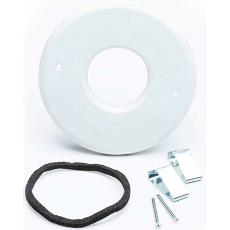 This item is the updated version of UPC-56B, plastic solid white surface mounted 5″ outside diameter, 1/4″ thick with a 2″ opening in the center; includes toggles and screws