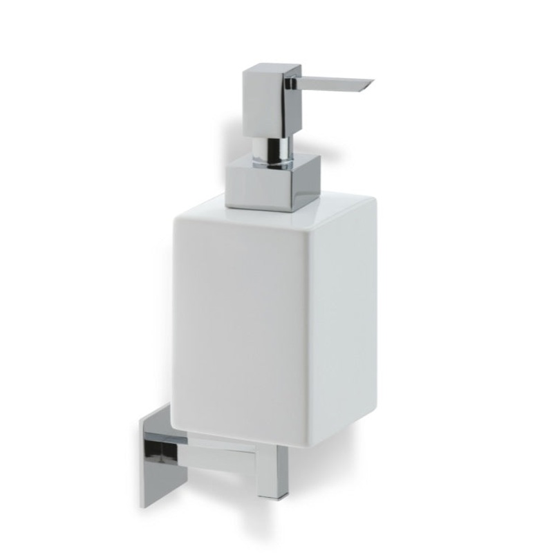 Modern design square bathroom wall liquid gel dispenser. Square soap dispenser container is made ceramic with a white finish. Soap dispenser wall mount and hand pump are made out of brass with a polished chrome. Made in Italy by StilHaus.Modern design wall