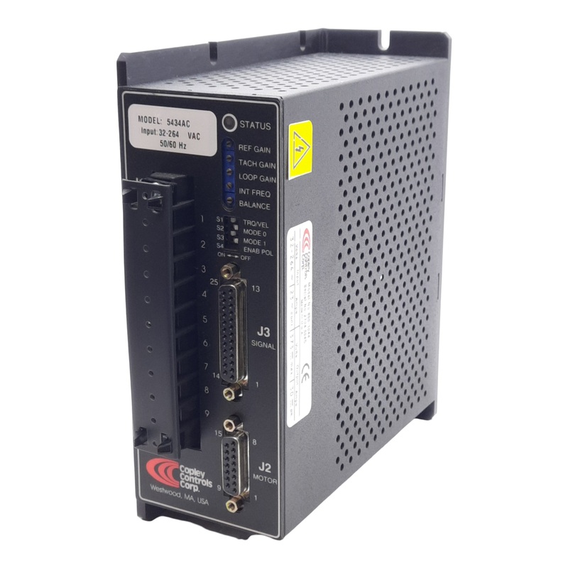 From our inventory we are selling a Copley Controls 5434AC Servo Amplifier, 32-264VAC 23A Input, 373VDC 30A Output.
