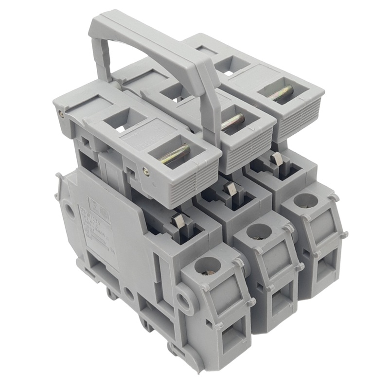 From our inventory we are selling a Entrelec MB10/22.S3 Fuse Holder, 3-Pole 10×38, 750VAC 32A Max, DIN Rail.