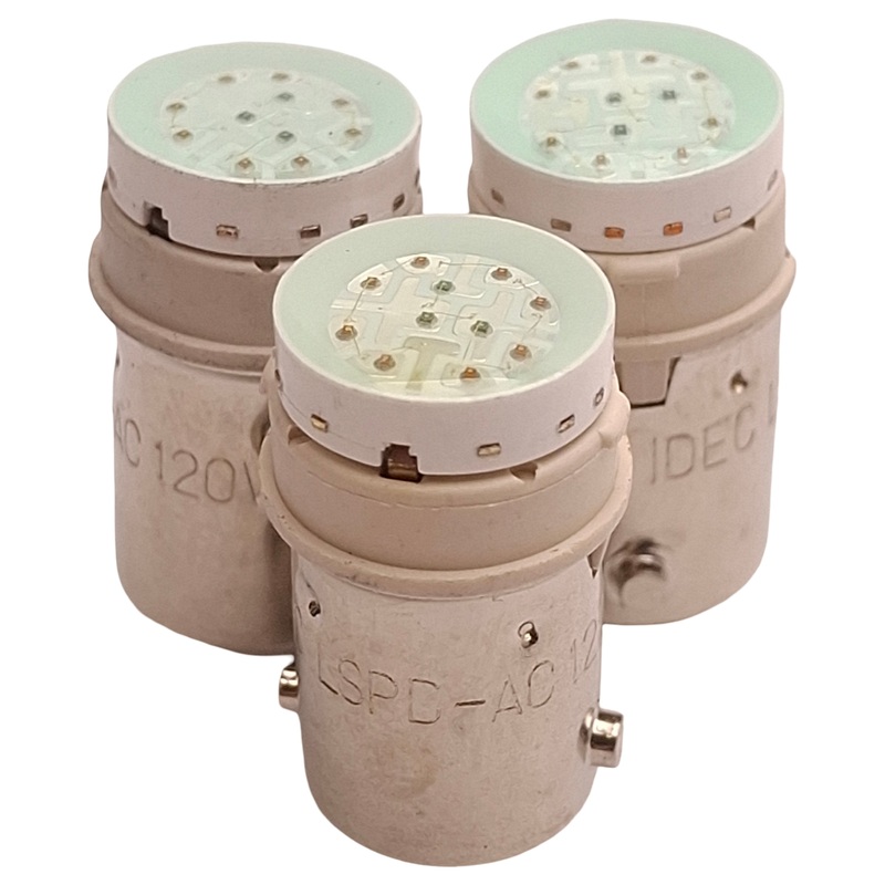Item Condition: UsedSKU: SB-207122ST8-5-CFrom our inventory we are selling a Lot of 3 Idec LSPD-AC120V Pushbutton LED Bulb, Green, 120VAC, 22mm Mount. Specifications:Model #:LSPD-AC120V, LSPD-120GMore Information: Lot of 3 Idec Pushbutton LED BulbColor: Gr