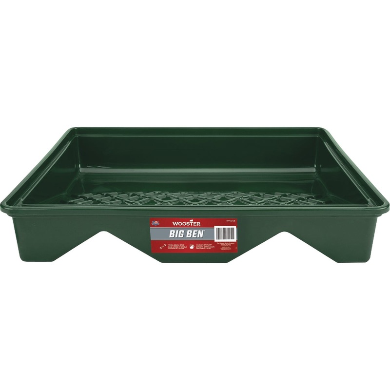 Big 21 In. polypropylene tray provides roll-off area for 18 In. frames. 1 gallon working capacity saves time. Green, copolymer polypropylene resists solvents and paint build up. Handy edge compartments hold brushes and tools. 21 In. W. x 16 In. L. x 4 In.