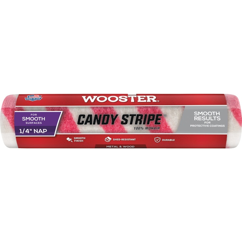Shed-resistant mohair fabric blend with maximum mohair for all paints, enamels, urethanes, epoxies. Produce a flawless smooth finish; red and white candy stripe design for extra sales appeal. Green, double-thick polypropylene core resist water, solvents an