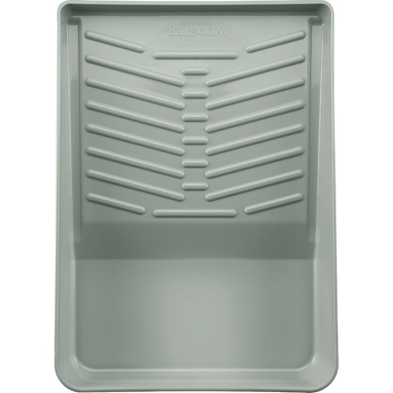 Rust-proof solvent-resistant, gray copolymer polypropylene. Sturdy, ribbed roll-off area for even loading. 11 In. W. x 16-1/2 In. L. x 2-1/2 In. D.
