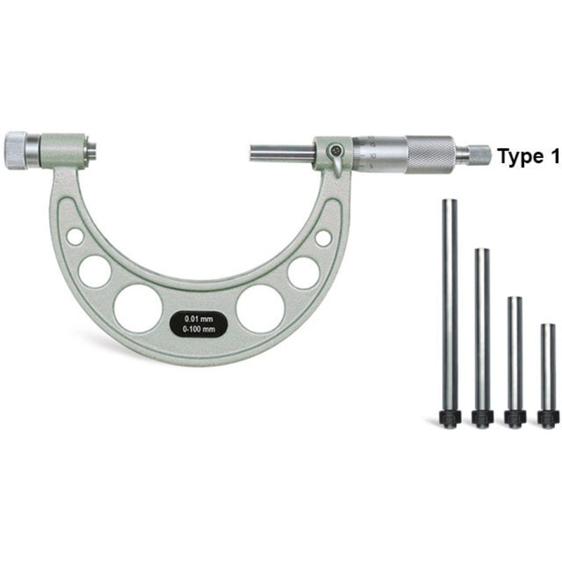YAMAYO INTERCHANAGEABLE OUTSIDE MICROMETER 0-100 MM (TYPE 1)FEATURESWide measuring range with interchangeable anvils.Satin chrome scale.Durable frame with insulated grips.Carbide tipped measuring faces.Provided with Ratchet stop for constant force.Supplied