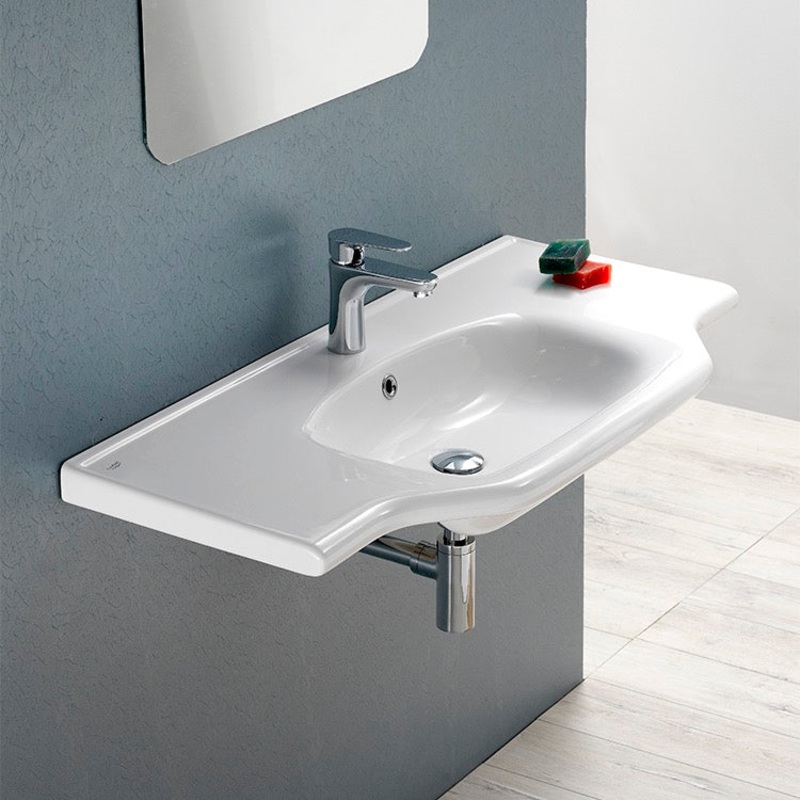 A classically styled 40" wall mounted or self rimming bathroom sink with a single faucet hole and included overflow. Both sides have ample counter space for all your bathroom essentials. Made out of high-quality ceramic.ADA CompliantCurved rectangular whit